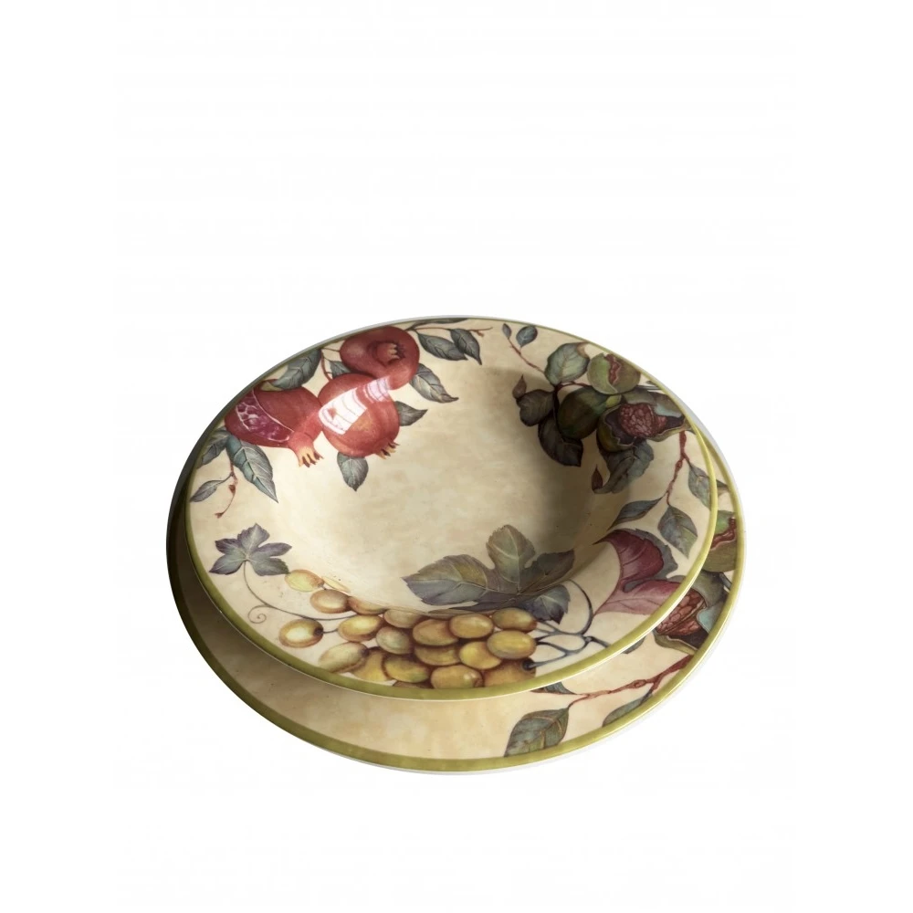Servizio di piatti in fine porcellana con decoro unico ed originale decoro composto da 38 pezzi: 12 Piatti fondi 12 Piatti piani 12 Piattini frutta 1 Piattino antipasto 1 Insalatiera In più in omaggio 6 coppette macedonia Prezzo scontatissimo