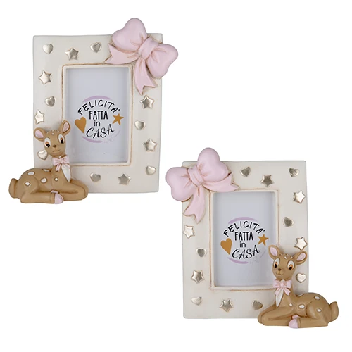 BOMBONIERA PER BATTESIMO TENERO CERVO PORTAFOTO ROSA CM.11 H.13