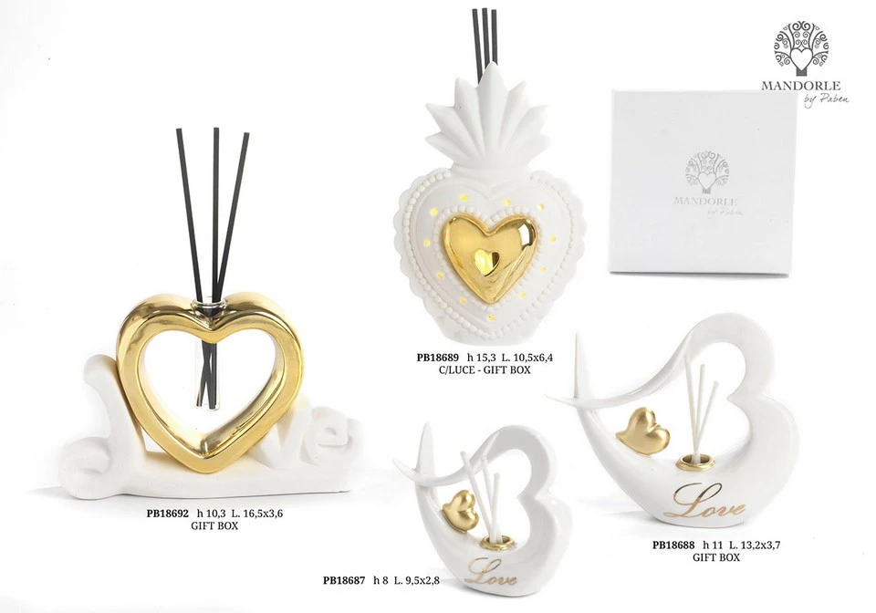 SET DIFFUSORE CUORI ORO 9.2 CM. PORCELLANA C/LUCE