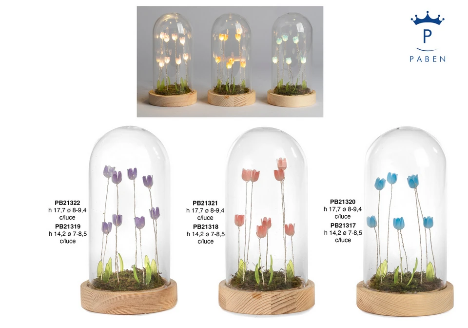 AIUOLA TULIPANI ILLUM. ROSA 14.2 CM. CAMPANA VETRO B. LEGNO