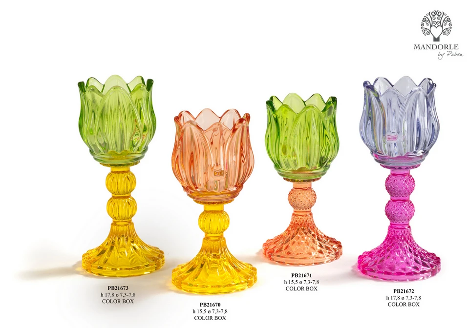 PORTACANDELA TULIPANO 15.5 CM. VETRO VERDE - ARANCIONE C.BOX