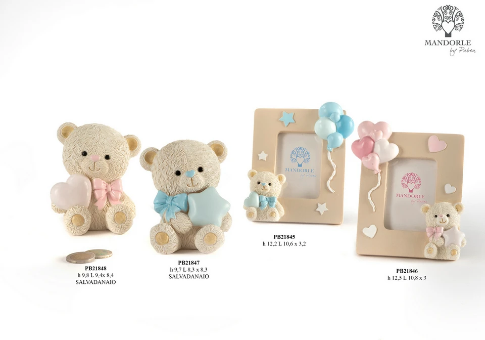Bomboniera per battesimo bambino: portafoto orsetto con cuore cm.9,8 - celeste