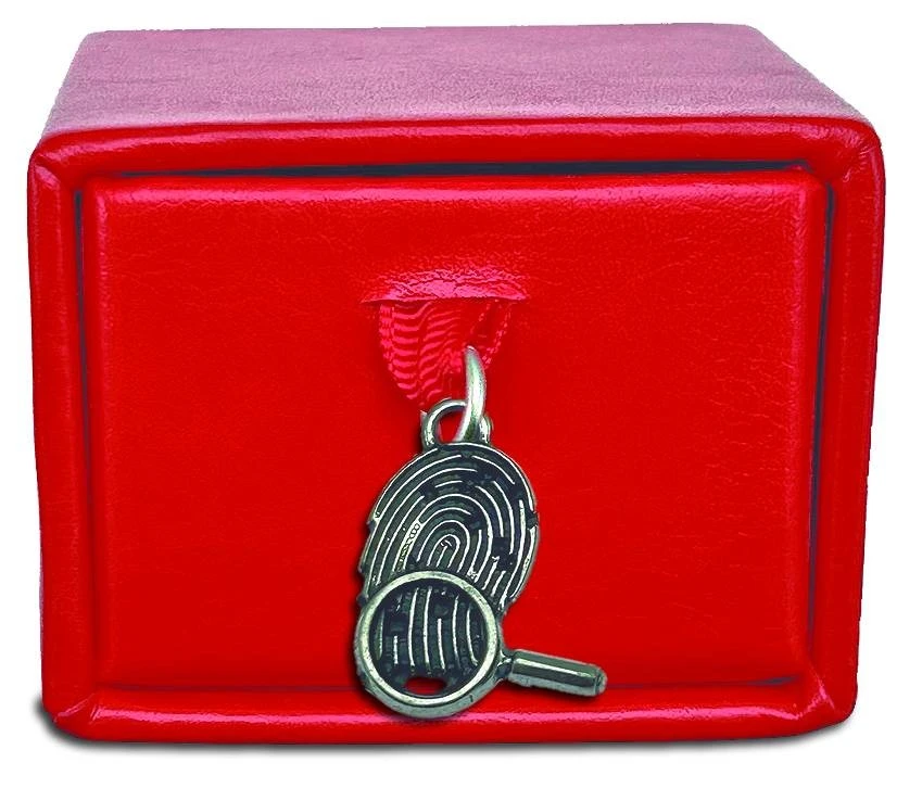 Scatolina porta confetti con ciondolo impronta digitale e lente di ingrandimento.