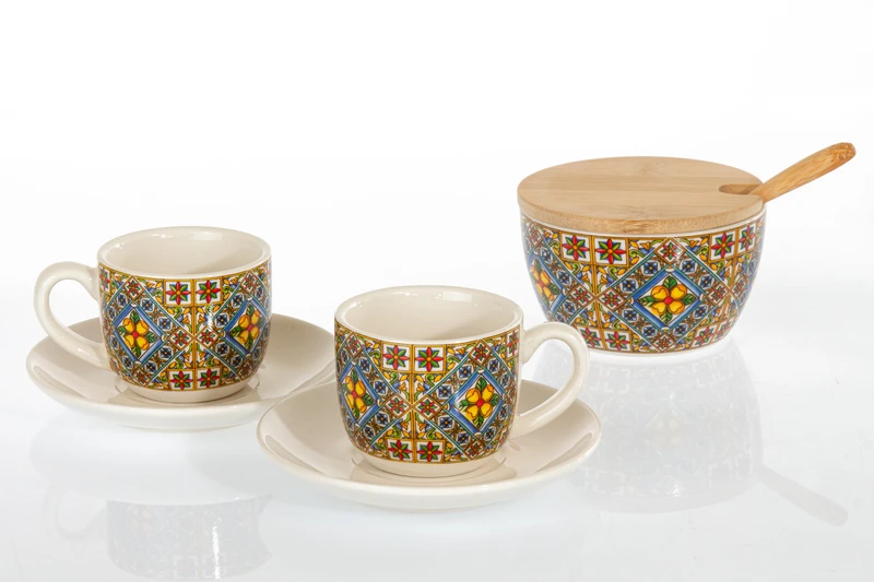 Bomboniera Solidale Cuorematto: Set 2 Tazzine Caffè e Zuccheriera Stile Maiolica decoro Mediterraneo