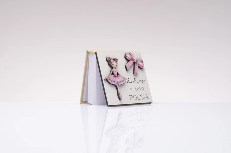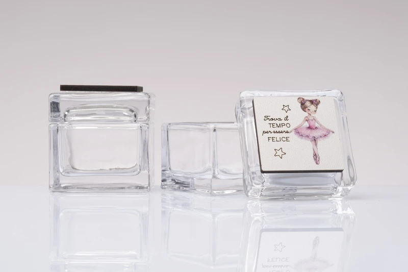 Bomboniera Solidale Cubo in Vetro con Ballerina in Legno: Porta Gioie Utile cm.5x5