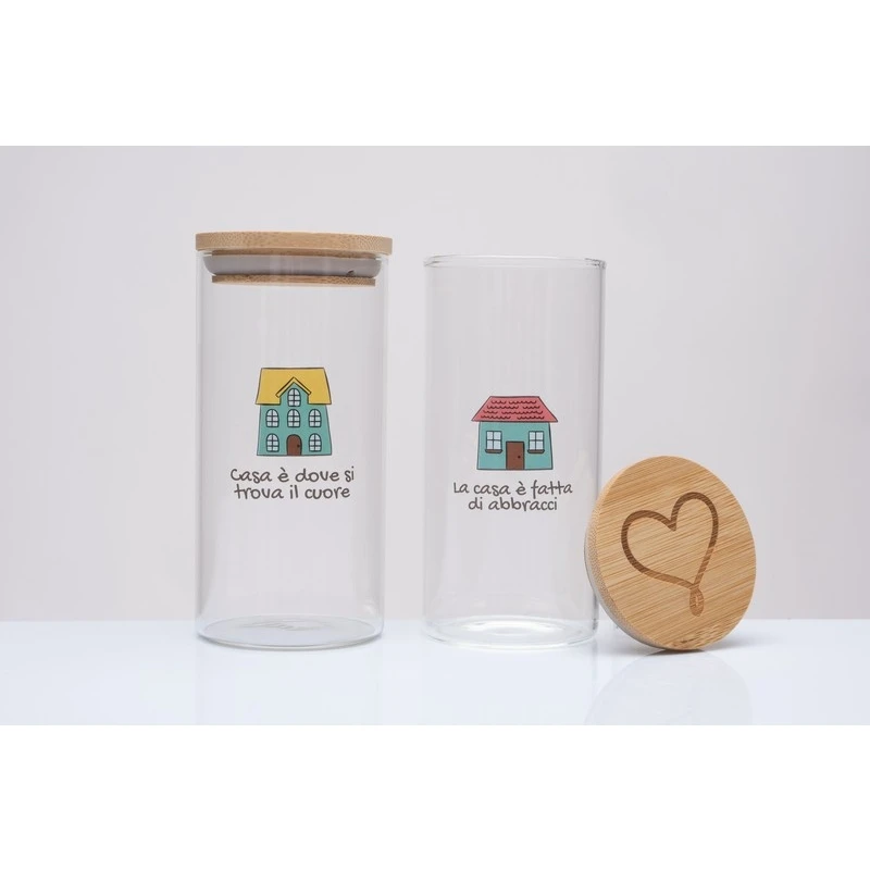 Barattolo Cucina Vetro Borosilicato Casetta Cuorematto - Bomboniera Matrimonio Solidale Utile cm.6x h.12