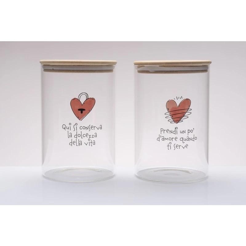 Elegante barattolo da cucina in vetro borosilicato con logo cuore Cuorematto. 2 decori assortiti, sono la bomboniera solidale e utile perfetta per il tuo matrimonio.