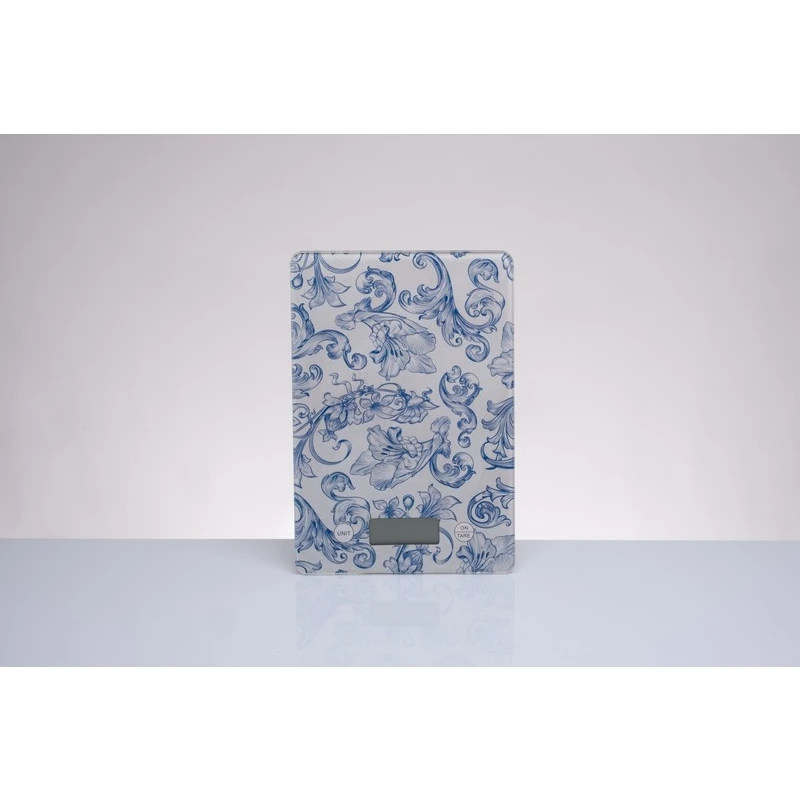 La bilancia presenta un piano di pesata in vetro temperato di alta qualità, igienico e facile da pulire. La superficie è impreziosita dal celebre decoro Fregio, caratterizzato da trame eleganti nei toni del bianco e dell'azzurro che richiamano lo stile delle maioliche classiche. Grazie al suo profilo ultra-sottile, può essere riposta facilmente o lasciata a vista come elemento d'arredo in cucina.