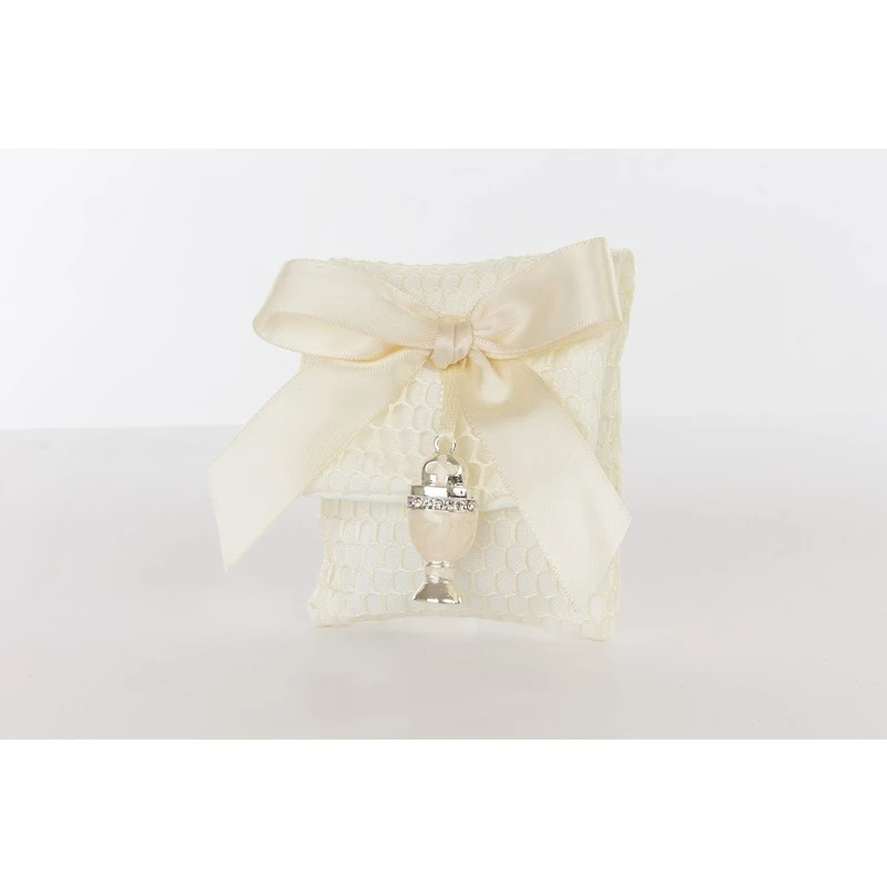 Bomboniera Solidale Comunione Cuorematto: Bustina a Rete con Ciondolo Calice e Confetti cm.8x9