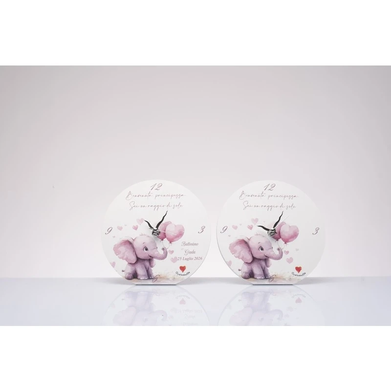 Orologio da tavolo solidale per bambina con elefantino rosa: perfetto per Nascita e Battesimo. Personalizzazione omaggio (min. 10 pezzi).