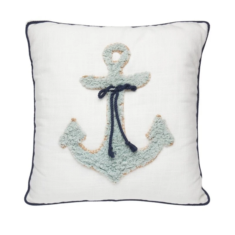 Cuscino in cotone con applicazioni e ricami dal tema marinaro. Un perfetto stile mediterraneo, morbido e confortevole. dimensioni: 45x45 materiale: Cotone con applicazioni e ricami