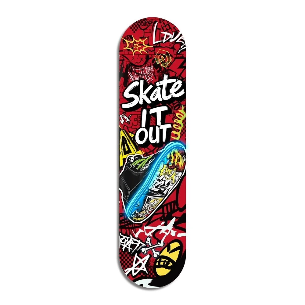 Rivoluziona il tuo concetto di decorazione murale con un pezzo unico che rompe gli schemi. Questo quadro artistico moderno, realizzato nell’originale forma di una tavola da skateboard, è l'essenza della cultura urban portata ad un livello superiore. Al centro dell'opera spicca una sneaker iconica, simbolo del movimento e della libertà, circondata dalla potente scritta motivazionale "Skate It Out".