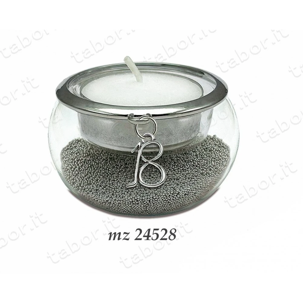 Portacandela sfera in vetro con decoro in metallo argento e ciondolo in metallo 18. Il portacandele arriva compreso di scatola. Il ciondolo è rivestito con particolare materiale che non si sporca, non si ossida e non si usura.