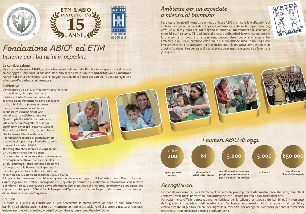 Anche quest’anno Quadrifoglio® rinnova la sua collaborazione con la Fondazione ABIO® Italia Onlus, che supporta i bambini ricoverati e migliora gli ambienti ospedalieri.