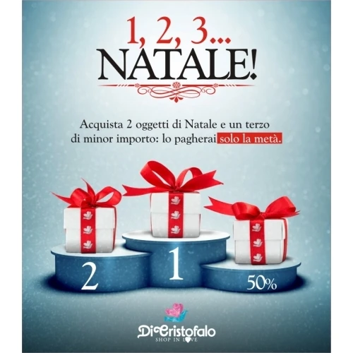 Nei nostri punti vendita è arrivata la promozione di Natale. Compra 2 oggetti delle nuove collezioni di natale e un terzo di importo uguale o minore lo pagherai solo la metà.In più tantissimi oggetti subito scontati del 50%.