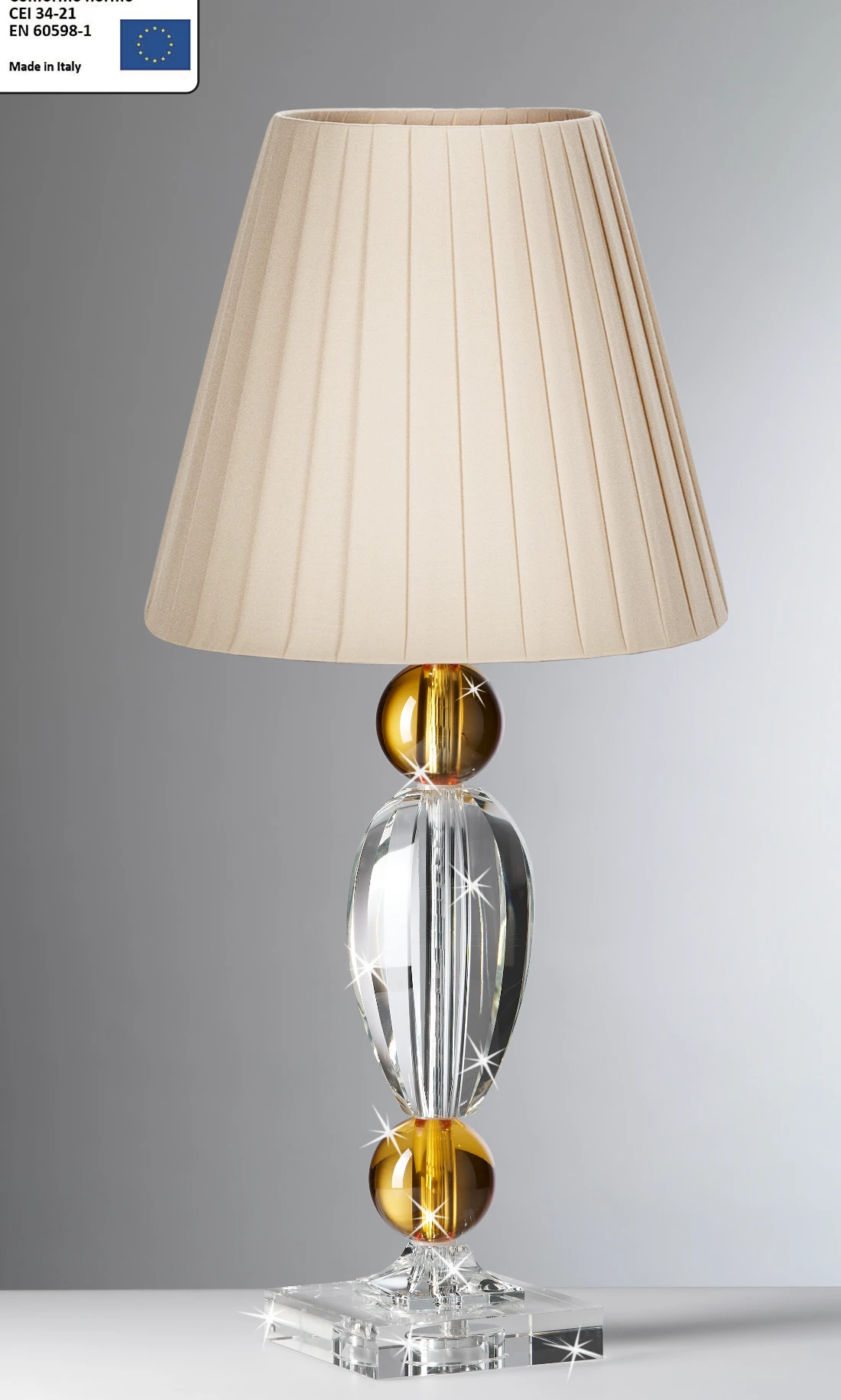 Lampada Ranoldi Classica: Cristallo Trasparente, Sfere Ambra e Paralume Avorio