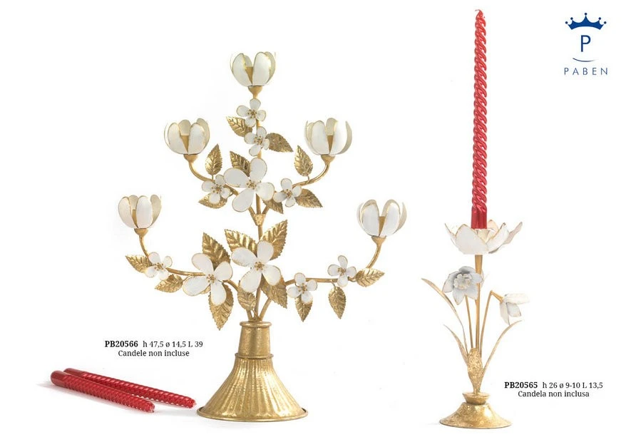 CANDELABRO CON FIORI E FOGLIE 47.5 CM. METALLO