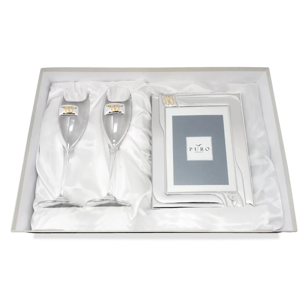 CONFEZIONE COPPIA FLUTE 50° ANNIVERSARIO CON PORTAFOTO 15X20