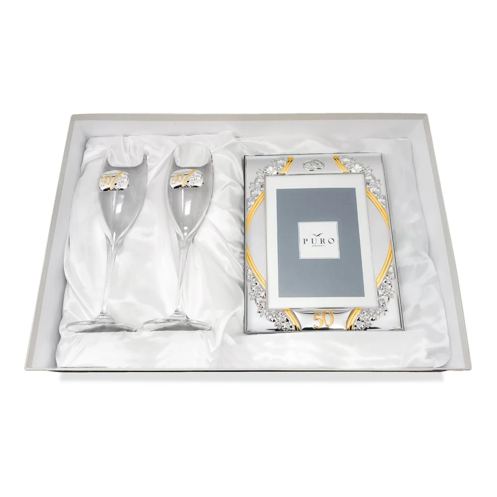 CONFEZIONE FLUTE E PORTAFOTO CM.15X20 NOZZE D'ORO