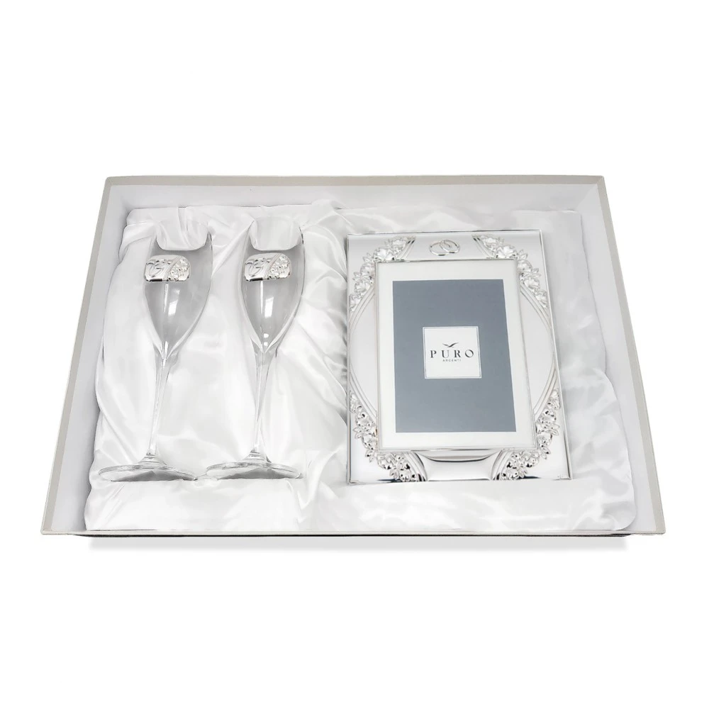 CONFEZIONE COPPIA FLUTE 25° NOZZE D'ARGENTO E PORTAFOTO 15X20