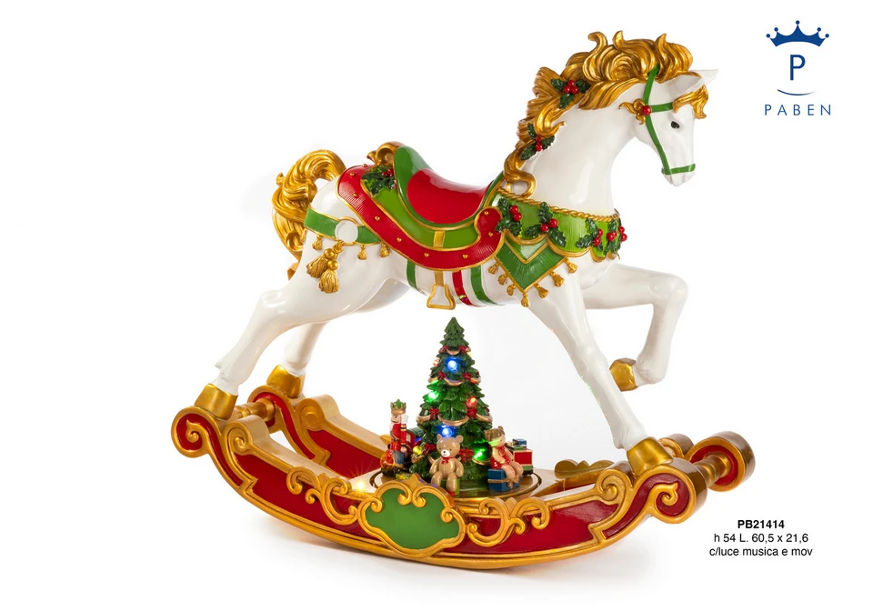 CAVALLO A DONDOLO DECORAZIONE NATALIZIA 54 CM. RESINA LUCI MUSICA MOVIMENTO