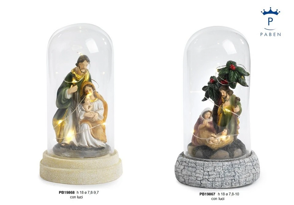 GRUPPO NATIVITA' 18 CM. RESINA CAMPANA VETRO LUCI