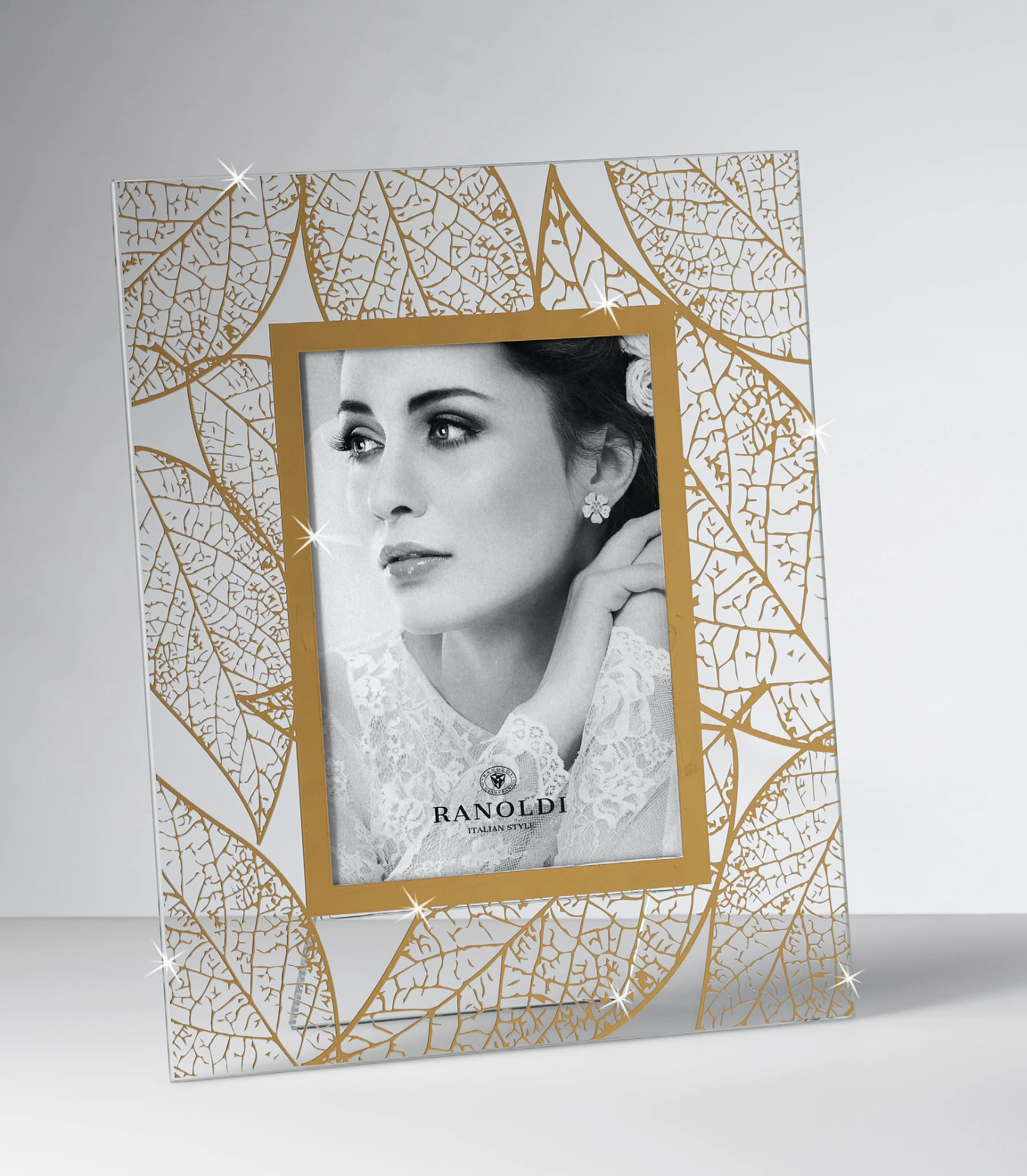 PORTAFOTO IN CRISTALLO SERIGRAFIA FOGLIE ORO cm.13X18 - RANOLDI